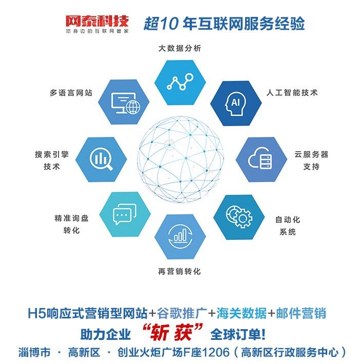 淄博网泰信息科技有限公司,团队人员超16年技术沉淀,专注企业网站建设(营销型网站,H5响应式网站,109语种网站)和网络营销(国内推广和google海外推广)。让企业不分大小,在任何时候,都能享受互联网的新成果。让企业通过互联网,开展电子商务,实现企业信息整合,将商机和梦想延伸到各地。合作案例有:金晶集团,天齐集团,泰宝集团等。